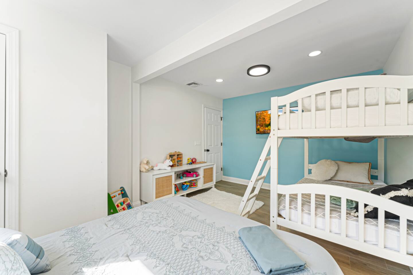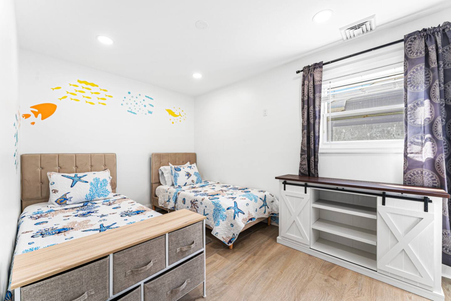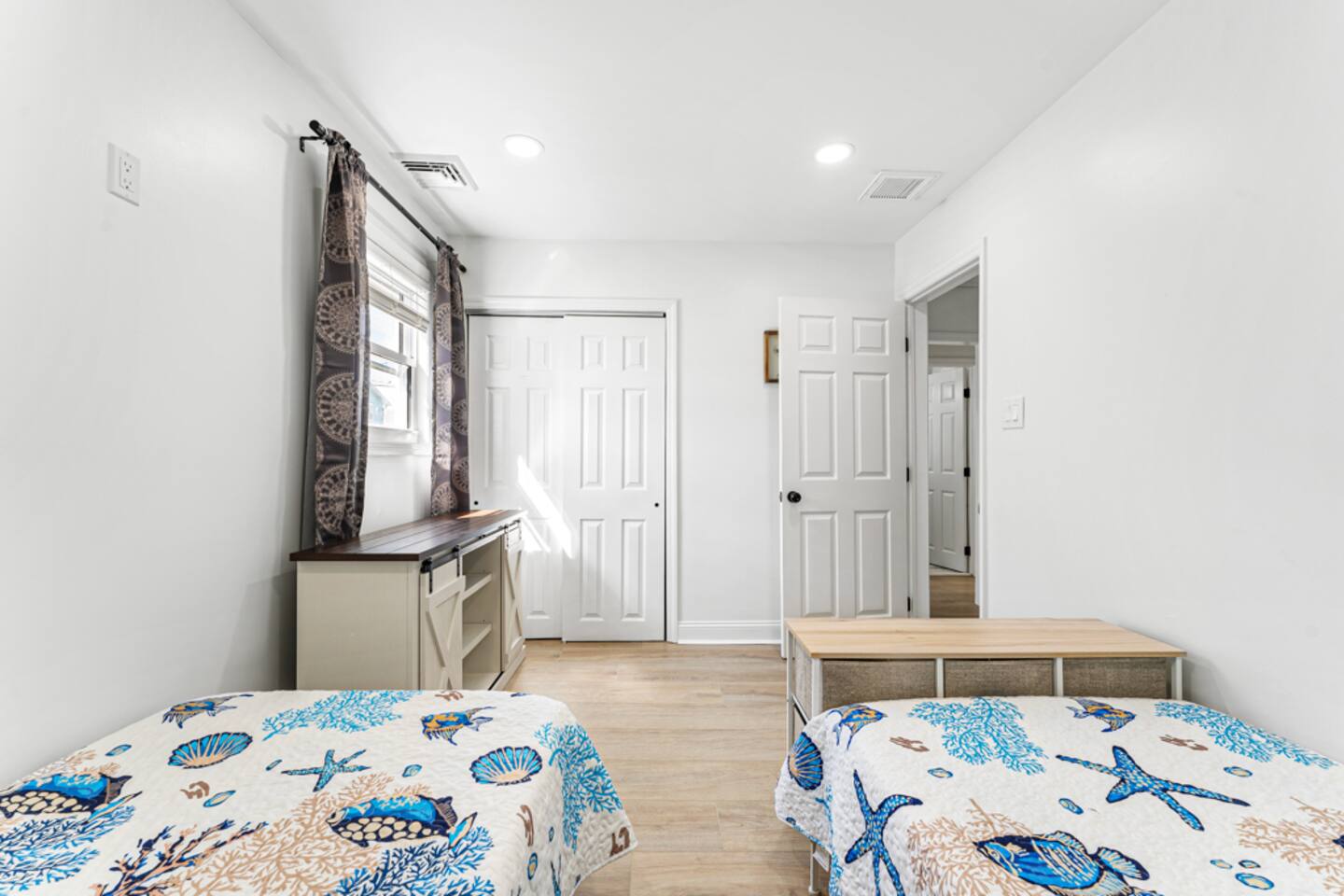 Guests can use closets and dressers in each room except for the front two bedrooms closets which are locked for owners use. The outside bar is available for use and should be kept closed when not in use. We provide a pack and play and high chair for our little guests as well. The kids room has plenty of toys and kids can play inside the house. There is also kid size beach chair and beach toys that you can take with you to the beach.